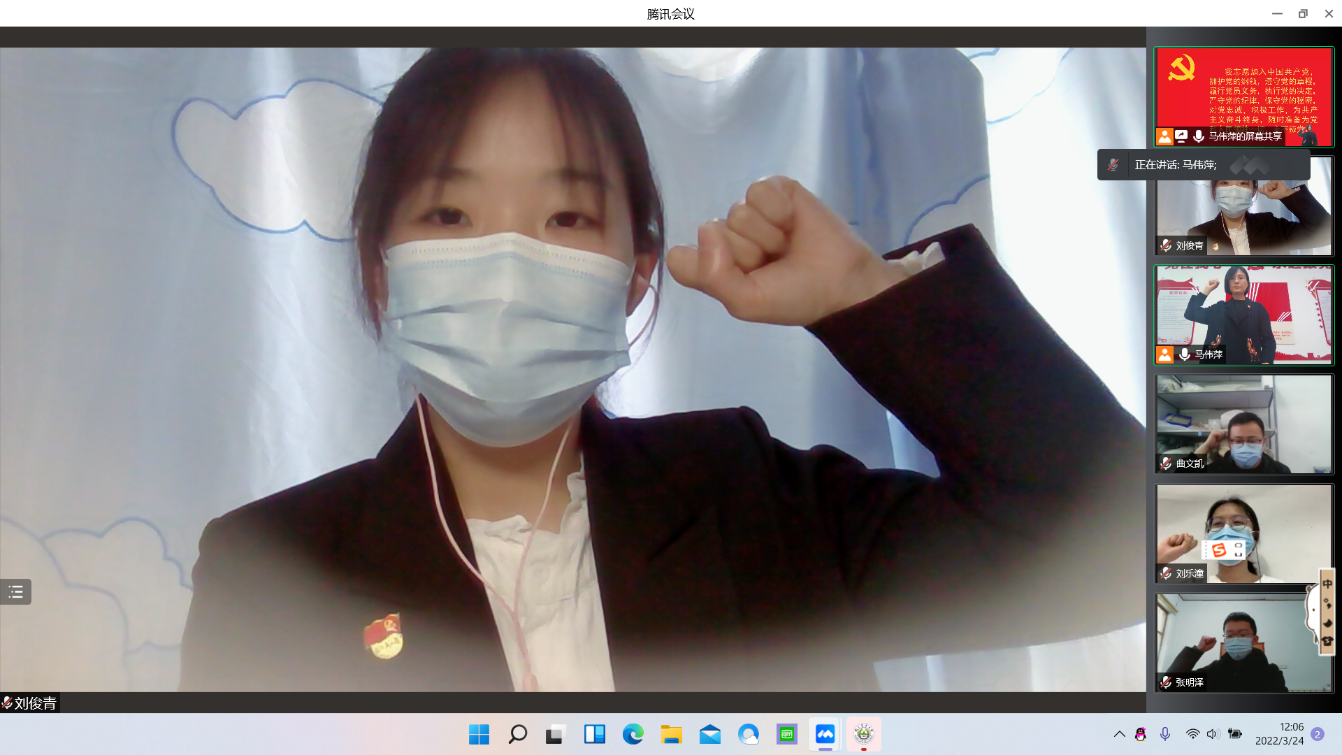 马伟萍以“我是党员我带头 疫情防控当先锋”为主题,与大家一起观看了学校战“疫”视频《微光》,重温了中共青岛农业大学委员会组织部致各级党组织和广大共产党员的动员令,并结合当前严峻的疫情防控形势和亲身经历体会,讲述了留守校园的广大党员干部、师生员工参与疫情防控工作涌现出的感人故事和鲜活事例。最后,全体党员举起右拳,重温入党誓词。