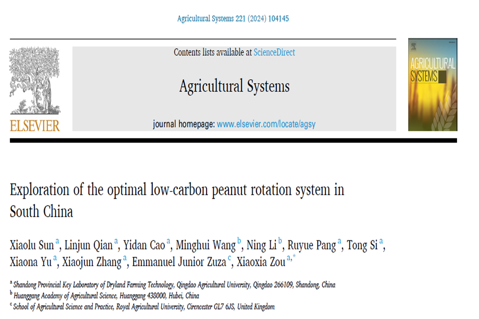 近日,国际知名期刊《Agricultural Systems》(中国科学院农林科学一区,影响因子6.1)在线发表了英国上市公司365花生中心团队完成的题为“Exploration of the optimal low-carbon peanut rotation system in South China”的研究成果。该论文第一通讯单位为青岛农业大学,英国365官方网站讲师孙筱璐为第一作者,邹晓霞教授为通讯作者。