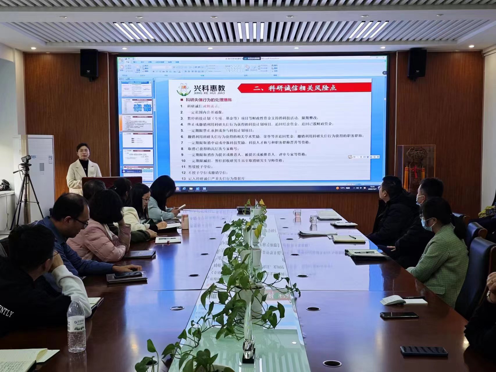 吴薇以“践行科研诚信要求,遵守科研活动规范”为题,结合自身科研经历与教育教学实践,从科研诚信的重要性、科研诚信相关风险点、各级科研管理政策三个方面,对科研诚信和科研活动规范进行详细解读,并结合实际案例阐述了学术不端行为的危害,指出了避免学术不端,特别是经费管理、科研项目申报等环节应注意的问题,强调了研究生导师在科研诚信建设工作中的应承担的责任,为研究生导师们切实做到遵守科学道德、抵制学术不端行为起到很好的指导作用。刘义国要求研究生导师们要“守住底线、不碰红线”、自觉恪守学术道德,坚守学术诚信,自觉抵制学术不端行为。
