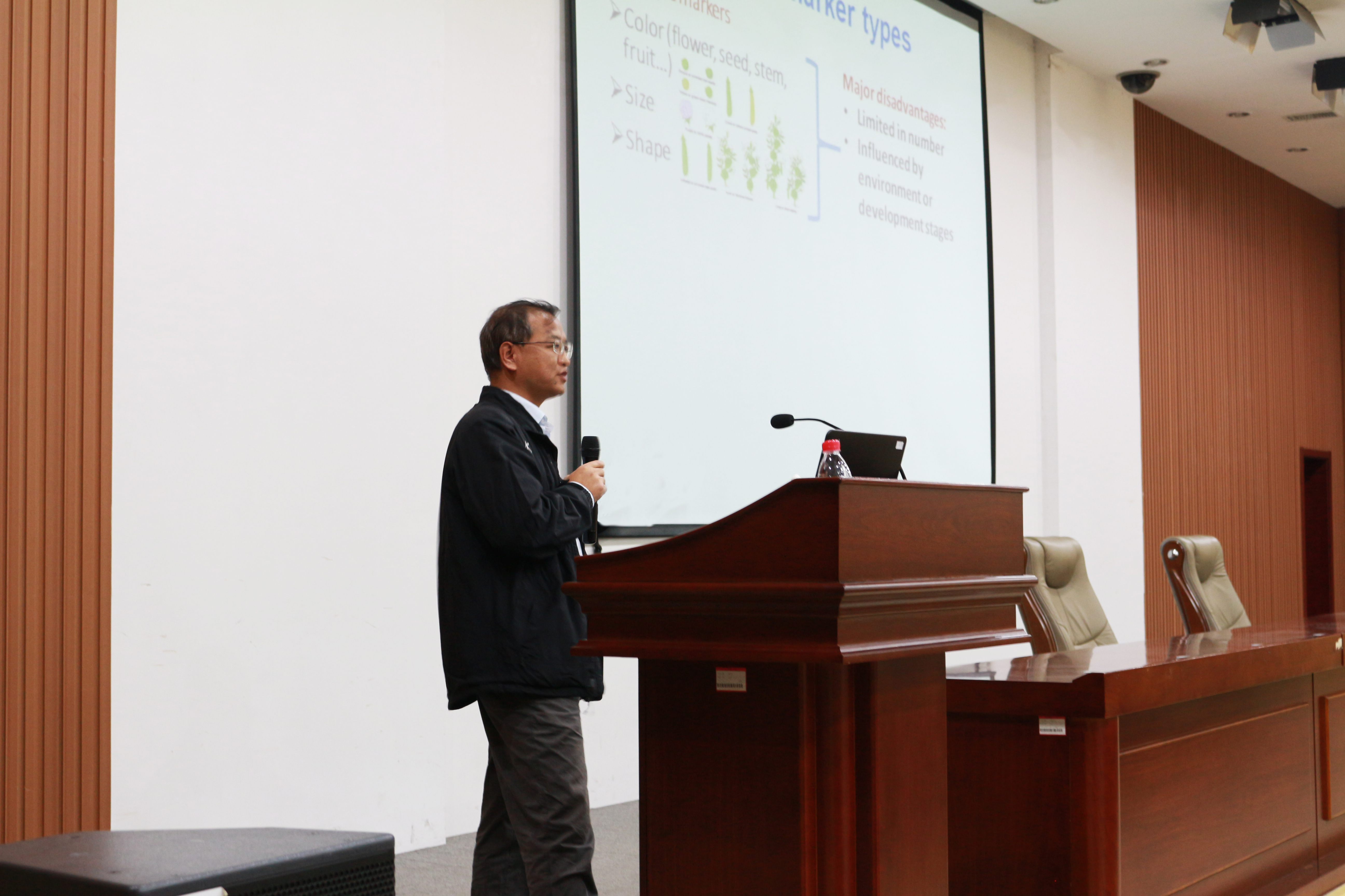 谭禄宾教授作了题为“水稻QTL精细定位、图位克隆与功能验证”的学术报告。他以水稻匍匐生长习性基因的图位克隆及野生稻基因渗入系的构建策略为切入点,详细介绍了水稻QTL精细定位、图位克隆与功能验证的研究进展,由浅入深,由宏观到微观,层层深入,引人入胜。在随后的交流环节,谭禄宾对现场老师和同学提出的问题做了耐心解答,并就基因图位克隆等问题分享了自己的深刻见解。整场报告会历时两个多小时,精彩而热烈,让在场的师生受益匪浅。