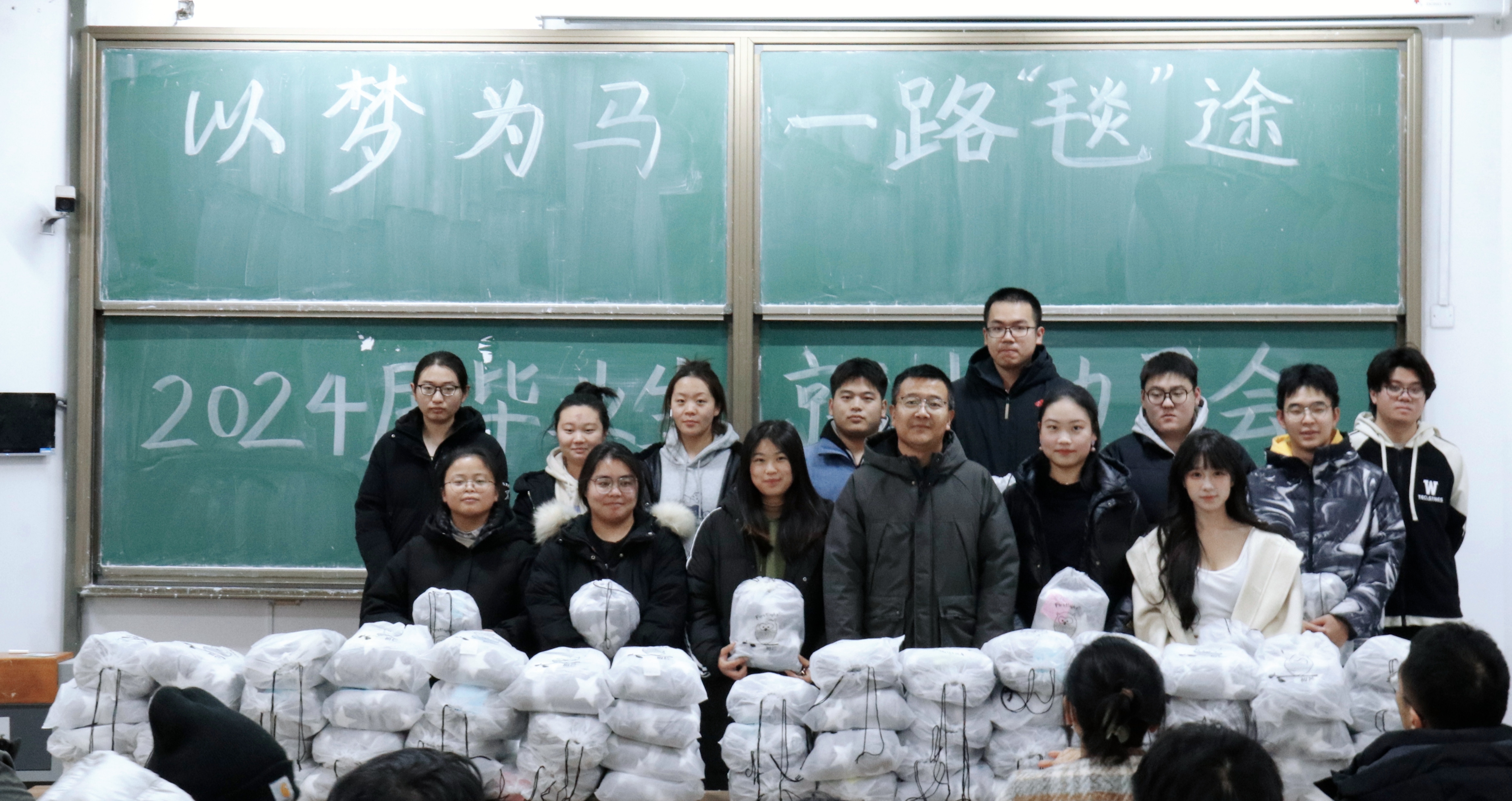 2020级班主任为各班学生代表送上学院准备的毛毯礼包,礼包中放有亲笔祝福的字条,希望能在严冬中给奋斗的同学们送去温暖。会后各班合影留念。