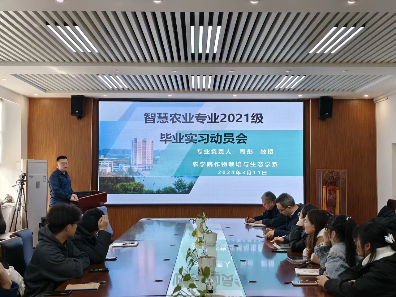 司彤首先介绍了本次毕业实习的主要内容安排、实习目标、实习条件、导师安排、实习纪律和实习成绩评定等内容。石勇从实习期间安全与纪律入手,要求同学们严格遵守学校、学院和导师所在实验室相关规章制度,提高安全防范意识,确保实习期间人身安全和实验室安全。孙占伟勉励同学们要心怀“国之大者”,心系“三农”事业,在实习过程中与导师保持密切沟通交流,努力掌握智慧农业相关理论知识和实践技能,服务乡村振兴国家战略。刘义国向同学们介绍了毕业实习的重要性,希望同学们牢牢把握本次实习机会,将课堂所学的理论知识与实践相结合,充分展示农科学子风采,力争在实习期间学有所获、学有所成,为本次毕业实习交上满意的答卷。
